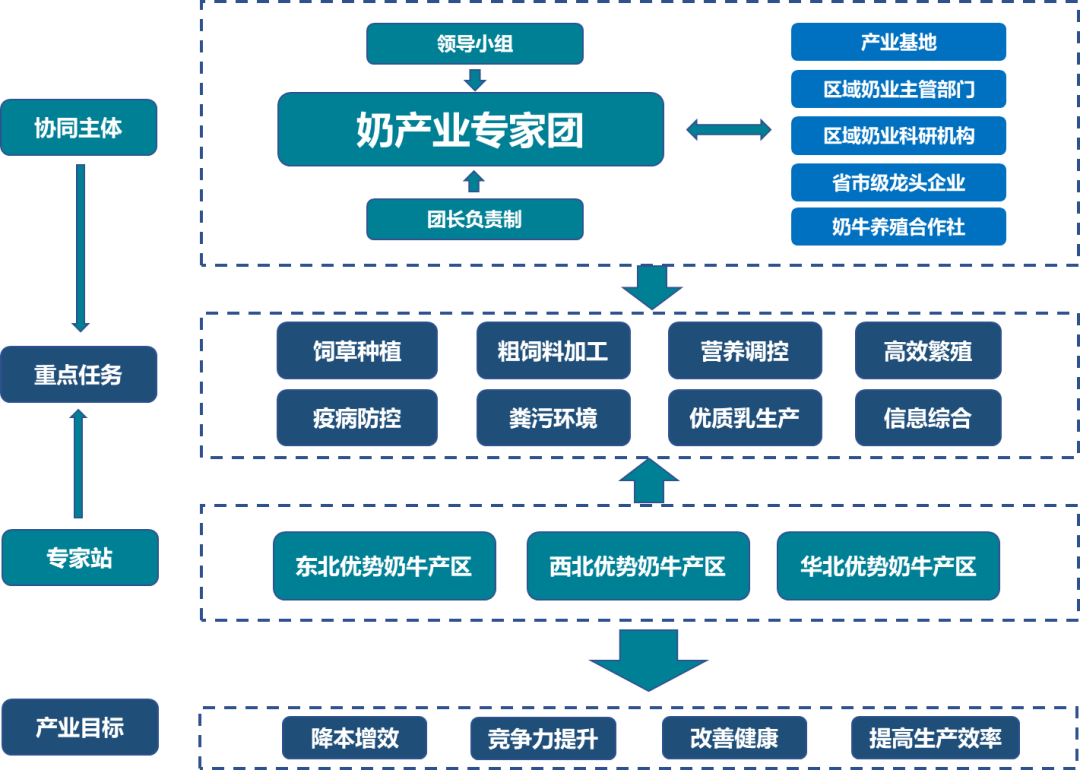 奶產(chǎn)業(yè)專家團(tuán)是一個(gè)服務(wù)型產(chǎn)業(yè)技術(shù)協(xié)作組織,主要任務(wù)是圍繞國家奶業(yè)振興行動和“十四五”奶業(yè)競爭力提升行動,服務(wù)奶產(chǎn)業(yè)降本增效,保障乳品質(zhì)量安全供給。專家團(tuán)設(shè)團(tuán)長1名、副團(tuán)長4名,分設(shè)9個(gè)專家工作站(詳見圖),每個(gè)工作站由飼草、營養(yǎng)、繁育、疾病、環(huán)境、加工、信息等方面專家組成。各站任務(wù)由牧醫(yī)所、草原所、飼料所、蘭牧藥、環(huán)保所、信息所等院內(nèi)相關(guān)創(chuàng)新團(tuán)隊(duì)及院外相關(guān)科研單位和主產(chǎn)區(qū)農(nóng)業(yè)推廣部門等共同組織承擔(dān),并與“奶業(yè)國際聯(lián)合研究中心”“中愛奶業(yè)可持續(xù)發(fā)展中心”和“國家奶業(yè)科技創(chuàng)新聯(lián)盟”等奶業(yè)平臺資源有機(jī)結(jié)合,構(gòu)建科研布局“一盤棋”、科企合作“一條龍”、技術(shù)方案“一體化”的奶業(yè)協(xié)同創(chuàng)新與應(yīng)用格局。結(jié)合奶業(yè)全產(chǎn)業(yè)鏈技術(shù)需求,進(jìn)行如下重點(diǎn)任務(wù)分工與協(xié)作。