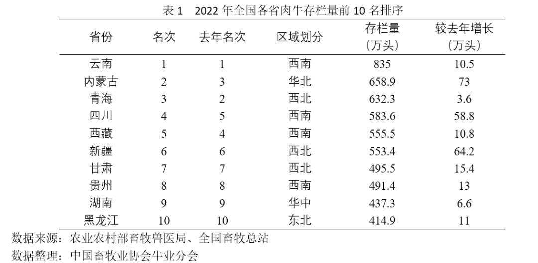 表1數(shù)據(jù)顯示,2022年全國(guó)肉牛存欄量前十名的?。▍^(qū))保持不變,名次略有變化,增幅最大的三個(gè)省分別是內(nèi)蒙古(73萬(wàn)頭)、新疆(64.2萬(wàn)頭)、四川(58.8萬(wàn)頭)。