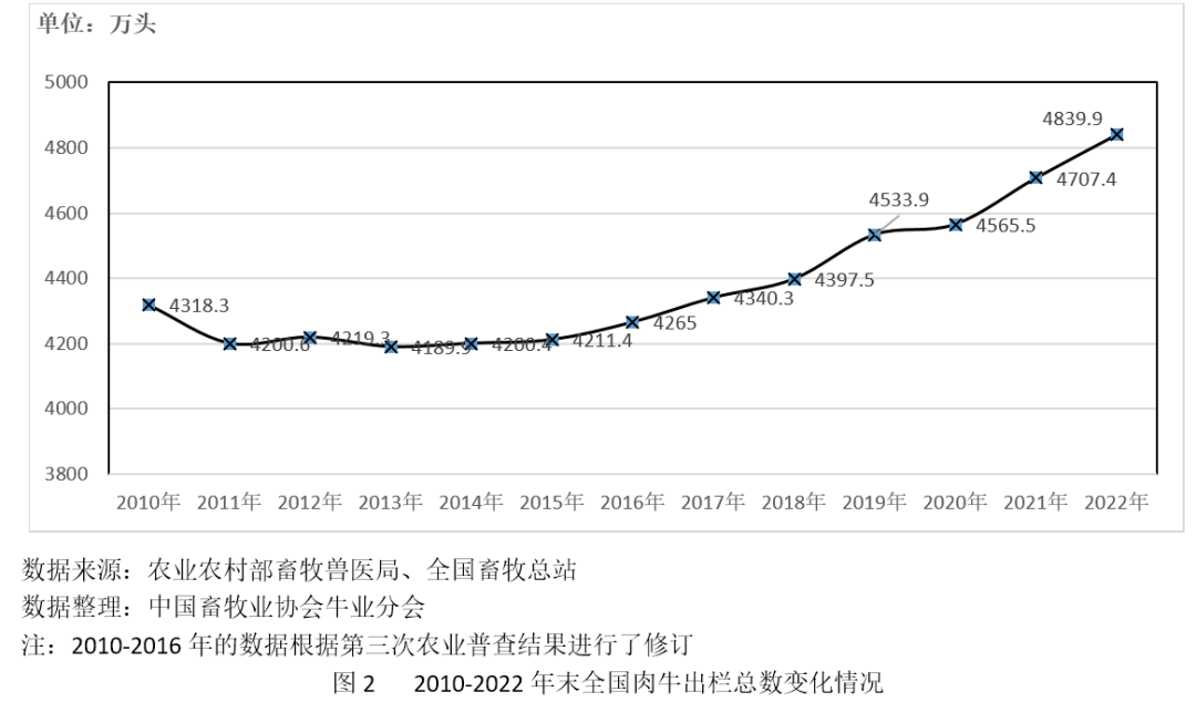2022年我國(guó)牛肉出欄量4839.9萬(wàn)頭,較2021年增加132.5萬(wàn)頭(見(jiàn)圖2),同比增長(zhǎng)2.8%,比2012年增長(zhǎng)14.7%。