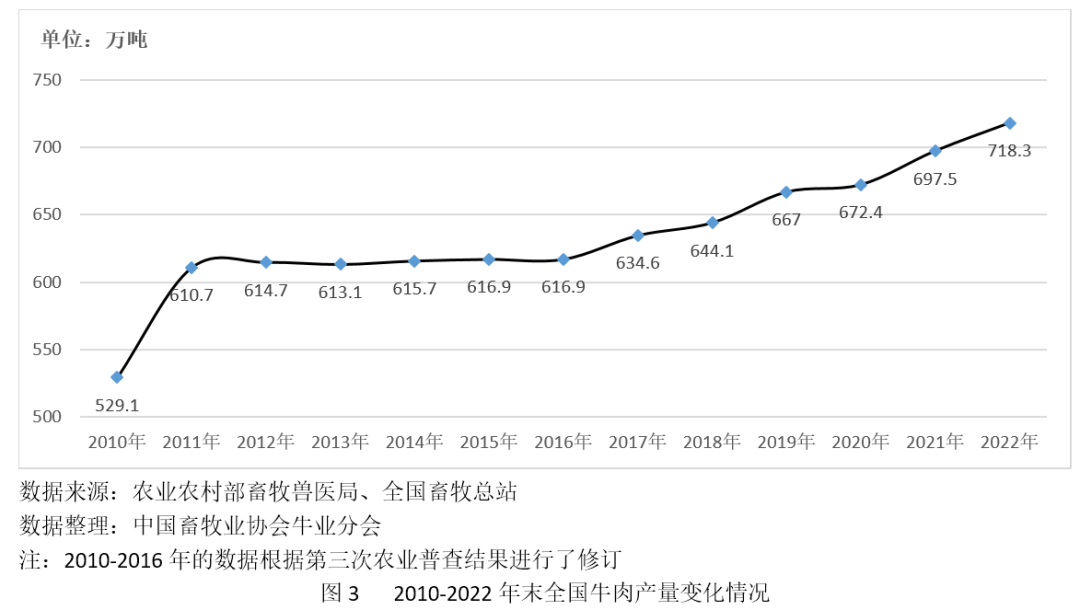 2022年我國(guó)牛肉產(chǎn)量718萬(wàn)噸,較2021年增加20.5萬(wàn)噸(見(jiàn)圖3),同比增長(zhǎng)2.8%,比2012年增長(zhǎng)16.8%。