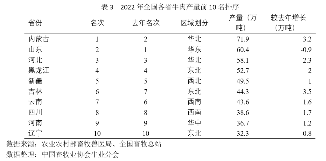 表3數(shù)據(jù)顯示,2022年全國(guó)牛肉產(chǎn)量前十名的?。▍^(qū))保持不變,僅山東出現(xiàn)負(fù)增長(zhǎng),同比減少0.9萬(wàn)噸。