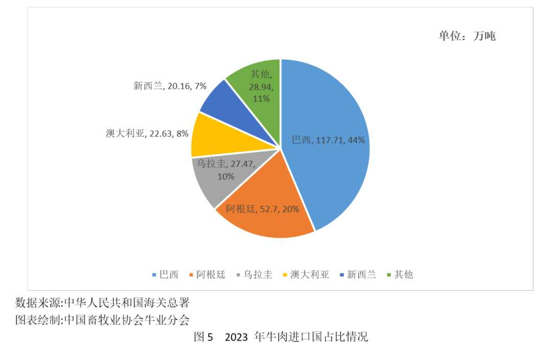 2023年,我國(guó)牛肉累計(jì)進(jìn)口273.74萬(wàn)噸,同比增加2%,進(jìn)口主要來(lái)自巴西、阿根廷、烏拉圭、澳大利亞及新西蘭,其中從巴西進(jìn)口117.71萬(wàn)噸,占比43%;從阿根廷進(jìn)口52.70萬(wàn)噸,占比19%,從烏拉圭進(jìn)口27.47萬(wàn)噸,占比10%;從澳大利亞進(jìn)口22.63萬(wàn)噸,占比8%;從新西蘭進(jìn)口20.61萬(wàn)噸,占比7%;其余從美國(guó)、加拿大及智利等國(guó)家進(jìn)口。