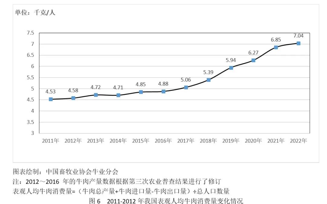 2022年我國(guó)表觀人均牛肉消費(fèi)量為7.04千克/人,同比增長(zhǎng)2.7%,比2012年增長(zhǎng)53.7%。