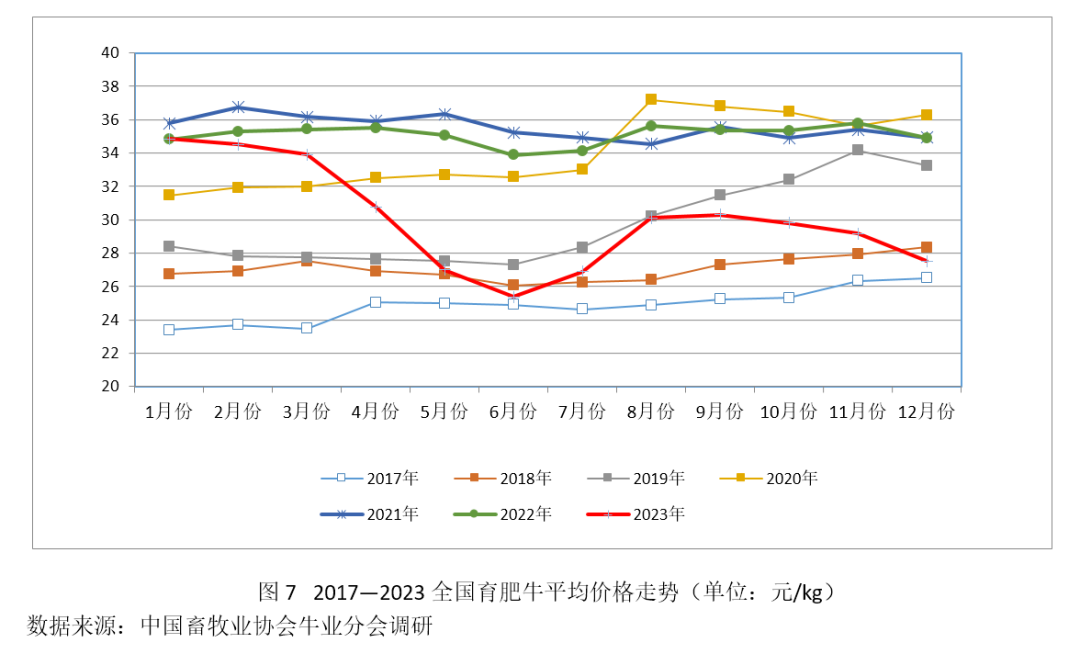 協(xié)會(huì)監(jiān)測(cè)數(shù)據(jù)顯示,2023年全國(guó)育肥牛(西門塔爾牛雜交牛為主)全年均價(jià)為30.02元/kg,同比下跌16.9%,國(guó)內(nèi)育肥牛2023年3月中旬開(kāi)始出現(xiàn)持續(xù)性價(jià)格下跌,據(jù)不完全統(tǒng)計(jì),2023年3~6月,東北地區(qū)大型肉牛屠宰企業(yè)“育肥牛收購(gòu)價(jià)格”出現(xiàn)了史無(wú)前例的23連跌,2023年6月全國(guó)育肥牛平均價(jià)格約25.39元/kg,跌至2017年11月以來(lái)價(jià)格最低點(diǎn)。同期成年繁育母牛市場(chǎng)價(jià)格跌至16~24元/kg,與2020年相比,跌幅約達(dá)55%。價(jià)格大幅跌落導(dǎo)致養(yǎng)殖從業(yè)群體抗拒心理不斷加劇,短期內(nèi)形成了群體性壓欄惜售的局面,造成活牛市場(chǎng)階段性供應(yīng)短缺,7~8月份國(guó)內(nèi)各地育肥牛行情陸續(xù)反彈,東北部地區(qū)8月末反彈上漲至30元/kg左右,逐漸傳導(dǎo)東北以外的肉牛主產(chǎn)區(qū)跟隨反彈,但是好景不長(zhǎng),9月份育肥牛行情再度出現(xiàn)下跌,12月份回落至27~28元/kg。