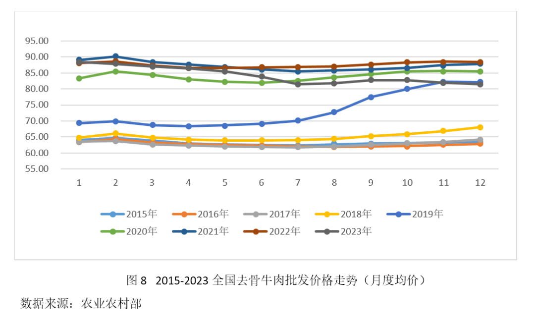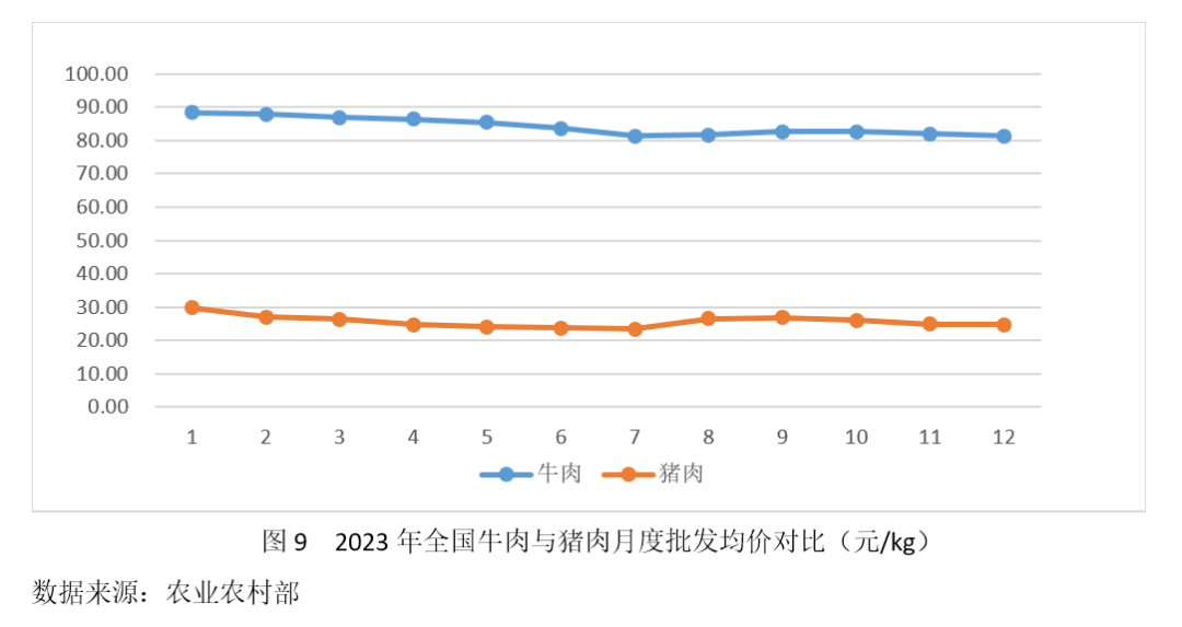 2023年國(guó)內(nèi)牛肉市場(chǎng)行情進(jìn)入下行通道,全年牛肉(去骨)批發(fā)均價(jià)約84.24元/kg,同比下降3.96%,月度牛肉價(jià)格跟隨活牛價(jià)格起伏而產(chǎn)生波動(dòng),且在12月份傳統(tǒng)消費(fèi)旺季降到81.41元/kg,成為2019年11月份以來(lái)月度價(jià)格最低點(diǎn),無(wú)獨(dú)有偶,2023年我國(guó)進(jìn)口牛肉市場(chǎng)同樣“遇冷”,平均到岸價(jià)格5195美元/噸,同比下跌21%。導(dǎo)致當(dāng)年牛肉行情下滑的原因主要包括四個(gè)方面:一是需求萎縮,消費(fèi)不振。當(dāng)前我國(guó)人口出現(xiàn)負(fù)增長(zhǎng),老齡化進(jìn)程加快,國(guó)內(nèi)牛肉傳統(tǒng)消費(fèi)進(jìn)入飽和階段,同時(shí)新的增長(zhǎng)點(diǎn)也增長(zhǎng)乏力,據(jù)國(guó)家統(tǒng)計(jì)局?jǐn)?shù)據(jù)顯示,2023年12月,全國(guó)畜肉類價(jià)格下降15.9%,影響CPI(居民消費(fèi)價(jià)格指數(shù))下降約0.56個(gè)百分點(diǎn),其中豬肉價(jià)格下降26.1%,影響CPI下降約0.43個(gè)百分點(diǎn),對(duì)于牛肉價(jià)格下降發(fā)揮著傳導(dǎo)作用;二是供給相對(duì)過(guò)剩。2022年我國(guó)牛肉總產(chǎn)量超過(guò)700萬(wàn)噸,比10年前增加了300多萬(wàn)噸,加上進(jìn)口的200多萬(wàn)噸,總量超過(guò)900萬(wàn)噸,在需求萎縮的時(shí)代背景下便呈現(xiàn)出供給相對(duì)過(guò)剩的局面,國(guó)內(nèi)牛肉市場(chǎng)的“供強(qiáng)需弱”也是造成肉牛及牛肉行情下滑的主要原因之一;三是進(jìn)口沖擊。隨著我國(guó)與雙邊、多邊國(guó)家政府自由貿(mào)易合作不斷強(qiáng)化,進(jìn)口稅率逐步下調(diào),致使涌入國(guó)內(nèi)消費(fèi)市場(chǎng)的進(jìn)口牛肉低價(jià)優(yōu)勢(shì)愈發(fā)凸顯;四是屠宰牛非自然性“增員”加劇?;钆J袌?chǎng)行情低迷誘發(fā)了繁育母牛被養(yǎng)殖者規(guī)模性棄養(yǎng)拋售宰殺、以肉計(jì)價(jià)的現(xiàn)象,與此同時(shí),由于奶價(jià)持續(xù)走低,奶牛養(yǎng)殖戶虧損嚴(yán)重,也開(kāi)始大批量淘汰奶母牛,進(jìn)一步擴(kuò)大了屠宰牛短期積蓄效應(yīng)。